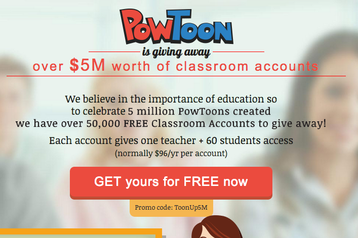 I have just signed up the free account, so I know it is still available. The free code is on my second image. Definitely worth it to check it out! Here is the direct link to Powtoon promotion: http://www.powtoon.com/lp/toonup/